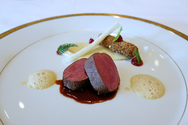 „Maibock“ Rücken und Keule aus der Bareiss Jagd mit fermentiertem Sellerie und Preiselbeeren. 9,5/10