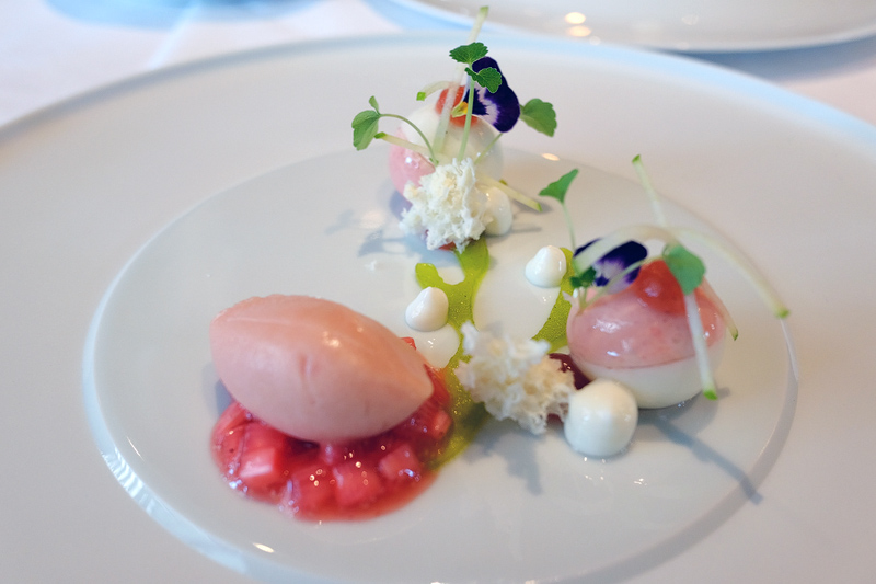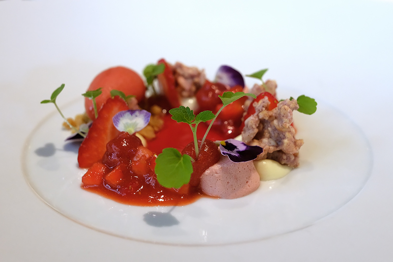 Erdbeercrème mit Reiscrispies und Erdbeersorbet.