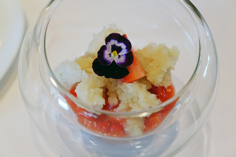 Grüntee-Litchi-Granité mit Erdbeeren.