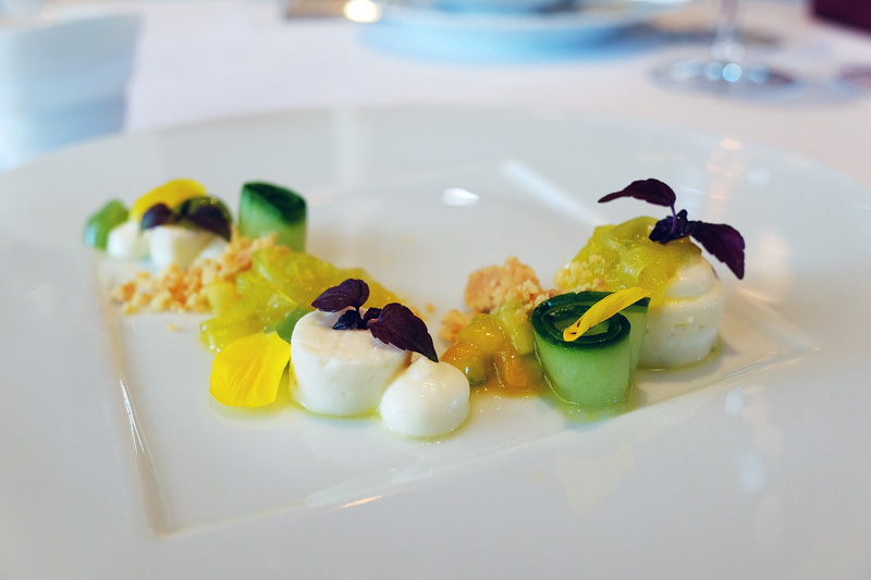 Eigentlich wäre der erste Gang gewesen: Terrine von gebratener Gänsestopfleber mit Rhabarber und Waldmeister. Dem Tierschutz zuliebe boykottieren wir solche Gerichte! Daher haben wir die Terrine durch den Saibling ersetzen lassen. Die folgenden drei Gänge Fisch sind optisch sehr ansprechend angerichtet und geschmacklich sehr gut bis hervorragend.