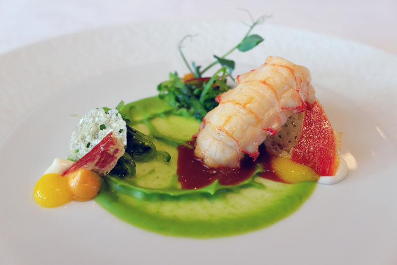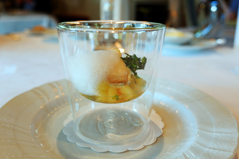 Sautierter Langostino mit Erbsenpüree, weißer Zwiebelroyale und Crustacé-Glace. 10/10
