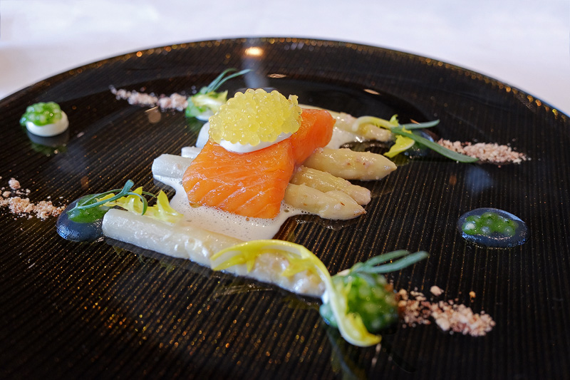 Saibling aus dem Würzbachtal mit geräuchertem Saiblingskaviar, Spargelspitzen und Estragon. 10/10