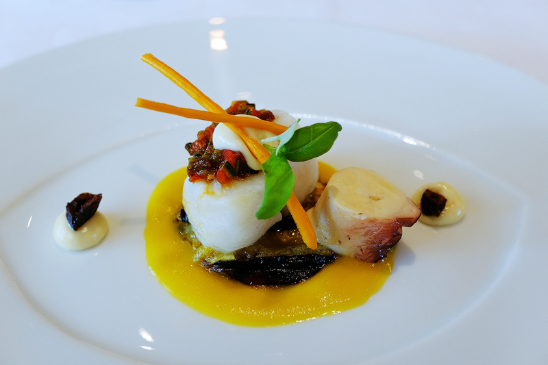 Kabeljau in Olivenöl pochiert mit Pulpo Aioli, gebratenen Auberginen und Knusper-Oliven. 9/10