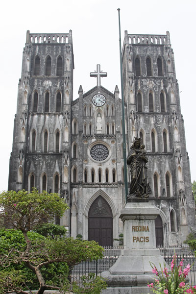 Zwei Stunden später fühle ich mich immerhin so fit, dass ich losziehe, um ein wenig die Stadt zu erkunden. Zuerst fühle ich mich mit der Kameratasche quer über der Schulter noch nicht so wohl. Spätestens an der übernächsten Ecke, als ich zur St. Josephs-Kathedrale komme, stelle ich dann aber fest, dass ich definitiv nicht der einzige westliche Touri bin, der hier mit Rucksack und Kamera durch die Straßen rennt. Die Kathedrale ist – wie vieles hier in Hanoi – ein Erbe der Franzosen. Laut Reiseführer ist sie bei den täglichen Gottesdiensten meist überfüllt – ich habe nicht vor, das zu überprüfen.