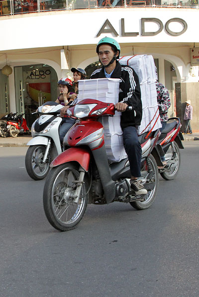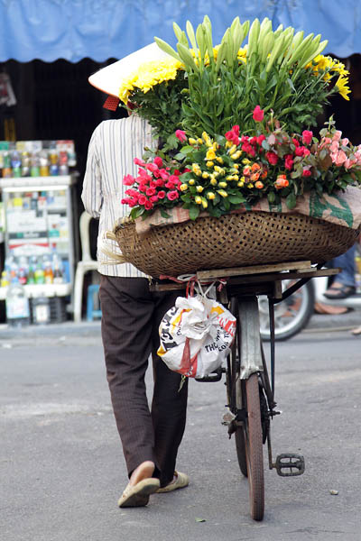 Hm, das Wasserpuppentheater wurde in einem meiner Reiseführer als Teil des "Pflichtprogramms" für Hanoi aufgeführt. Ein anderer Pflichtpunkt war eine Cyclofahrt durch die Altstadt. Ich beschließe also, mich bei dem schönem Wetter durch die Altstadt radeln zu lassen. Im Reiseführer wird der Tarif für eine Stunde mit "ab 20.000 Dong" angegeben - ich schaffe es immerhin, den Fahrer von 300.000 Dong auf 80.000 Dong herunterzuhandeln. ;-) Ich habe zwar deshalb den leisen Verdacht, dass ich wieder mal das mehrfache des Normalpreises bezahlt habe, aber eigentlich ist das ja auch egal. Ich finde es sehr entspannend, mich mal nicht zu Fuß durch die verkehrsreichen Straßen zu bewegen, sondern langsam an den Häusern und Geschäften vorbeizugleiten. Ein paar Fotos gelingen dabei auch.