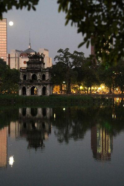 Wer genau hingeschaut hat, erkennt, dass man dem Pferd auch Bier geopfert hat, was ich sehr sympatisch finde. Ich bekomme dadurch auch gleich wieder Bierdurst und kehre in einem Café am Hoan-Kiem-See ein. Während ich dort sitze, dämmert es, und wenig später kann ich noch ein Foto des Schildkrötenturms machen.