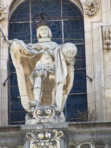 an der Fassade ein Denkmal für König Alfonso den soundsovielten. Er hat das letzte Stück Andalusien von den Mauren zurückerobert, weswegen ihm an vielen Kirchen Denkmäler gebaut wurden. In der Kathedrale von Sevilla steht auch eines.