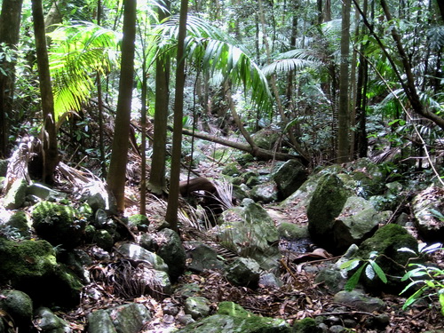 Nach kurzer Fahrt sind wir dann im Lamington National Park im Bereich der Binna Burra. Wir halten an einem Parkplatz. Der Guide verteilt an uns Proviant, ziemlich viel. Ich denke noch, wer soll das denn alles essen und trinken. Ganz schön schwer. Er sagt, dass wir jetzt 20 km wandern.