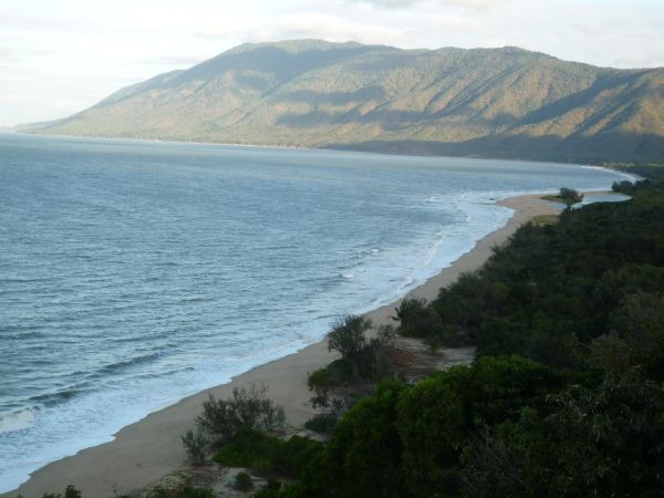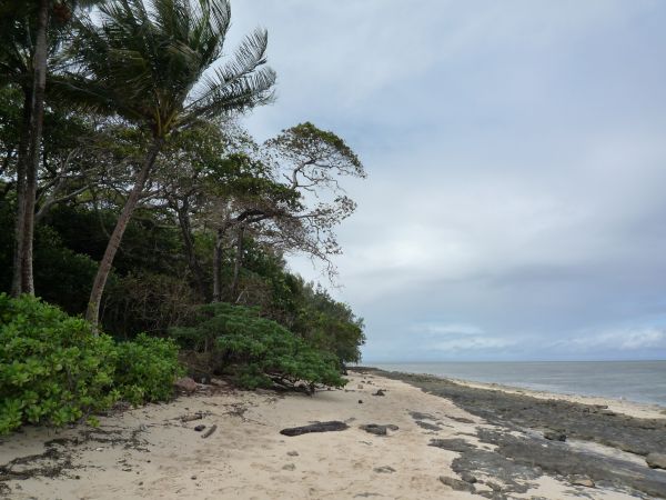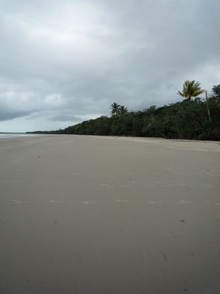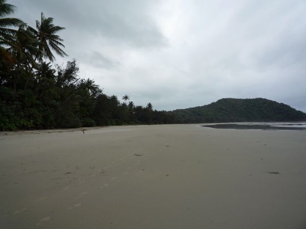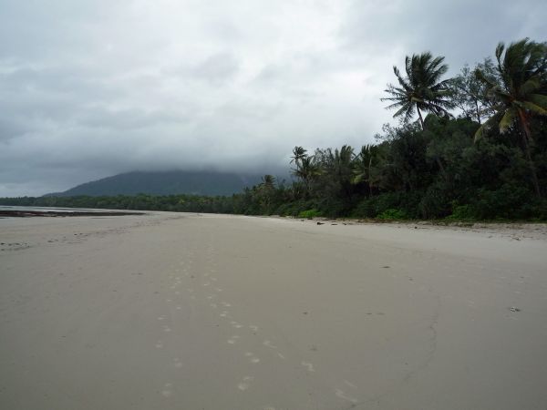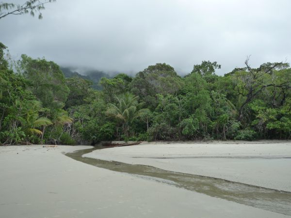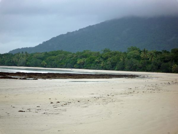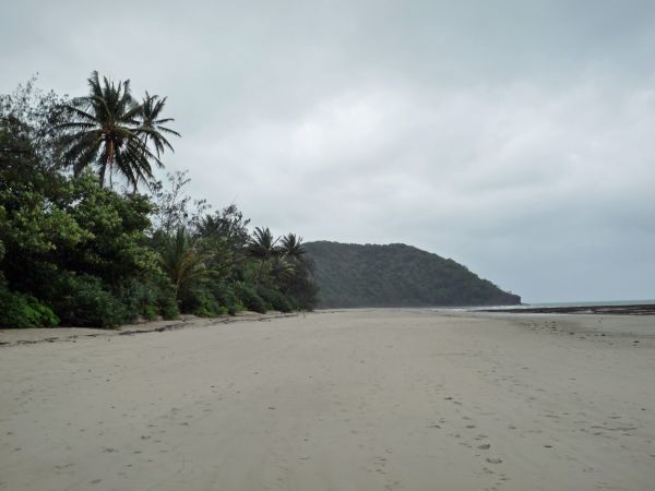 Unser Bootsmann entdeckt am Ufer eine extrem giftige Schlange und ist ganz begeistert. Wir können sie im Grün der Uferbewaldung nicht erkennen. Ist vielleicht auch besser so. Ein Problem ereilt uns an der Fähre über den Daintree River – hier wird nur Cash akzeptiert. Und wir haben doch kaum noch Bargeld. Brauchen wir ja eigentlich auch nicht, hier wird ja (fast) alles mit Kreditkarte bezahlt. Wir fahren gut 10 km zurück zum freundlichen Cross Roads Cafe, wo uns der nette Mitarbeiter die Kreditkarte belastet und uns mit Bargeld versorgt. Als wir wieder zur Fähre kommen, ist die Schlange schon länger als bei unserem ersten Versuch. Wir schaffen es dann auch erst auf das übernächste Schiff. Bis hierher hatten wir insofern Glück, als dass es zwar bewölkt, aber trocken war. Damit ist es jetzt vorbei. Nördlich des Daintree River wird es jetzt richtig tropisch – und fängt an zu regnen. Wir erreichen Cape Tribulation. Hier kommt wirklich Cross Boarder Stimmung auf. Und das warme Regenwetter passt zu dem Camp. Hier hat man wirklich das Gefühl an der Grenze zur Zivilisation zu leben. Das Camp Zentrum mit BYO Pub ist in einem großen Verschlag mit übergehängter Plane und Wellblbechdach untergebracht. Naja einen Billardtisch gib es hier schon, rechts und links regnet es und man sieht direkt in den Regenwald. Wir schlagen uns während einer Regenpause über einen Pfad zum Cape Tribulation Strand durch – malerisch! Bei dem grauen Himmel kommt aber er nicht ganz so zur Geltung. Egal – hier ist es richtig cool!