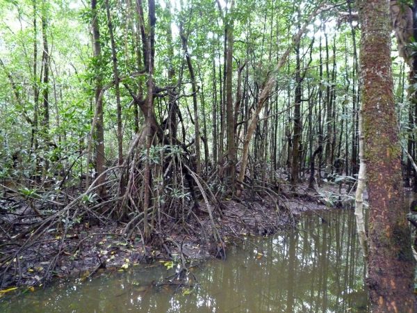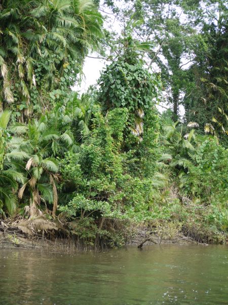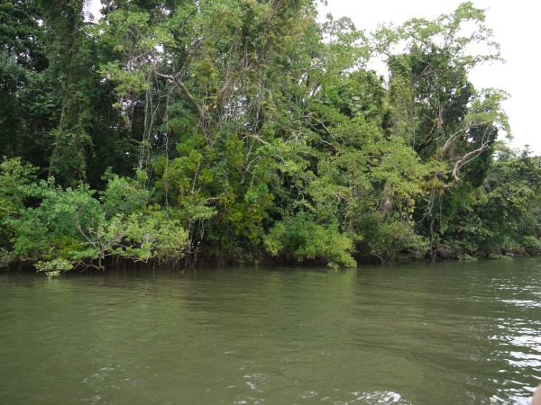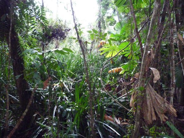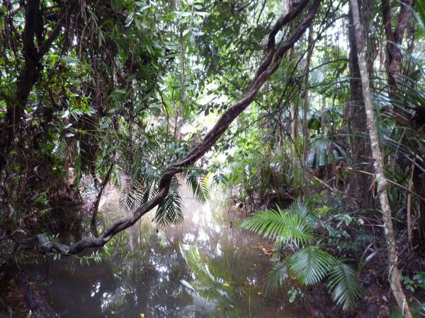 Auf dem Rückweg kommen wir durch eine Art Sumpf. Das Wasser reicht hier bis in den Regenwald.