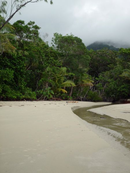 Wir bemerken wieder einmal die Warnschilder, die vor dem Boxjellyfish warnen. Die Quallen sind hier echt übel. An einer Stelle kommt ein kleiner Fluss aus dem Regenwald und fließt ins Meer.