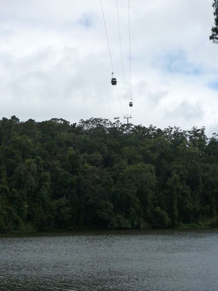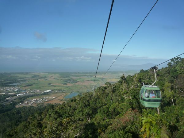 Da wir noch einiges an Zeit haben, um mit der Seilbahn zurückzufahren, bummeln wir jetzt erstmal über die Kuranda Märkte. Klar gibt es hier viel Ramsch, aber es ist eine sehr nette Atmosphäre. Auch original „German Wurst“ gibt es hier – das mutet bei dem ganzen Hippieflair doch irgendwie lustig an. Zwischen den Häusern ist an einer Stelle ein Dach gespannt und es gibt ein paar Tische und drum herum improvisierte Imbisstände – ein kleiner Foodcourt quasi. Wir holen uns eine Kleinigkeit und stellen uns an eins der zu Tischen umfunktionierten Fässer. Als ein Biertisch frei wird, setzen wir uns auf die Bank und schauen dem Treiben zu. Die Hippieklamotten sind schon lustig. Dann machen wir uns auf den Rückweg und laufen die paar Schritte zur Seilbahn, die über den Regenwald wieder in Tal Richtung Cairns führt. Die erste Teilstrecke sitzen wir mit zwei Japanerinnen in der Gondel, die mit Minnie Maus Pullover und ihrem Gekicher sehr schulmädchenartig rüberkommen, komische Leute… Sandra ist nicht so ganz wohl, ihre Höhenangst macht sich bemerkbar. Vor allem dann, wenn die Gondel an den Trägermasten vorbeikommt und etwas ruckelt. Der Regenwald von oben ist allerdings sehr interessant anzusehen und auch der Ausblick Richtung Meer ist sehr malerisch: