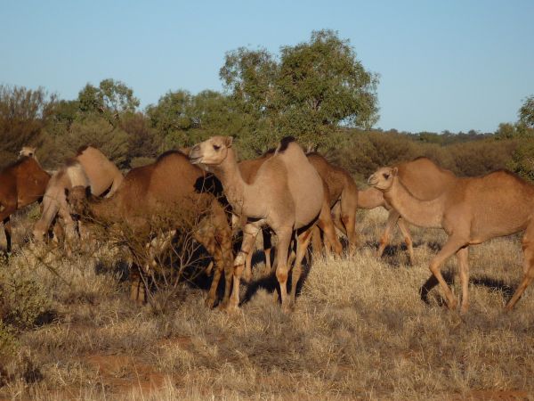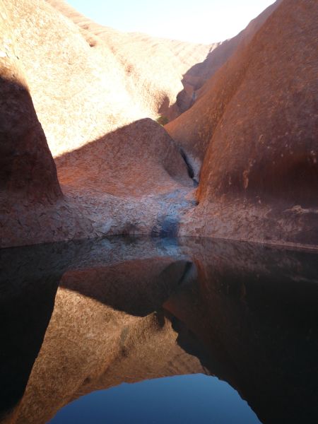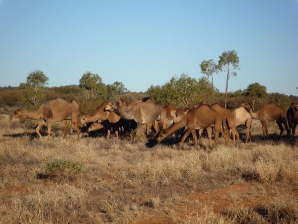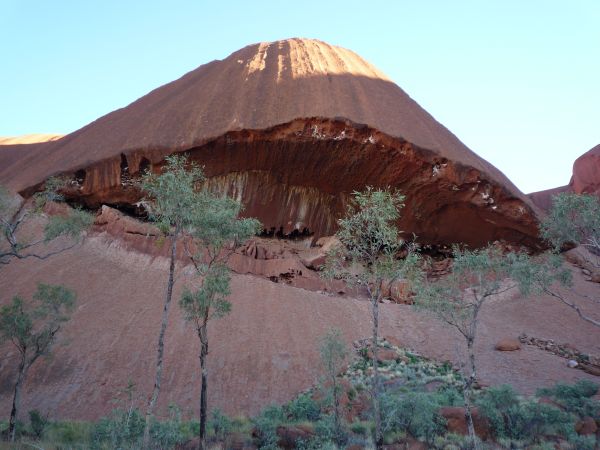 Mit dem Sonnenaufgang verschätzen wir uns etwas. Es ist doch ein ganzes Stück weit raus zum Uluruh. Als wir merken, dass wir es zum Sunrise Point nicht mehr schaffen, beschließen wir, zum Kulturzentrum zu fahren. Das hat auch seine Vorteile. Um kurz nach 7 sind wir die einzigen und können uns ungestört alles ansehen. Danach geht’s los zum Base Walk – einmal um den dicken Brocken herum. Zusammen mit den Stichtrails, die davon abzweigen sind das gute 14km. Wir haben ja alle Zeit der Welt und die lassen wir uns auch – für Fotos, Bestaunen des Berges und Pausen. Gleich zu Beginn treffen wir auf eine wilde Kamelherde. Die Australier mögen die ja gar nicht, wie wir später erfahren - eine importierte Seuche.