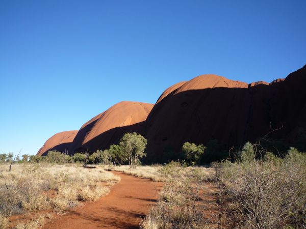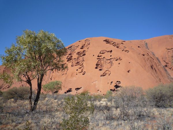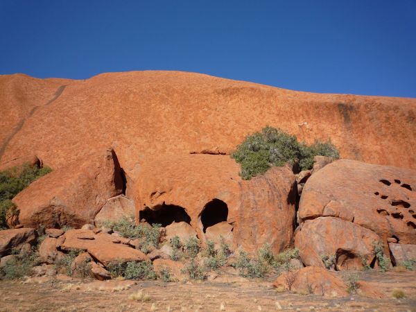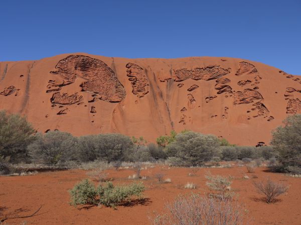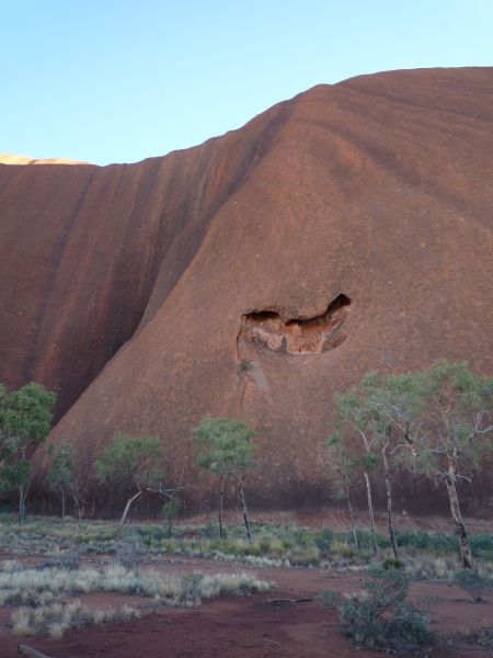 Nun geht es aber ab auf die Runde. An einigen Stellen soll man keine Fotos machen, weil dort für die Aboriginees religiös wichtige Stellen am Berg sind. Aber wo fangen die Begrenzungen an und hören wieder auf? Wir hoffen, dass wir da nichts falsch machen. In Sichtweite von den Schildern knippsen wir jedenfalls nicht. Aber ganz auf Fotos mögen wir auch nicht verzichten...