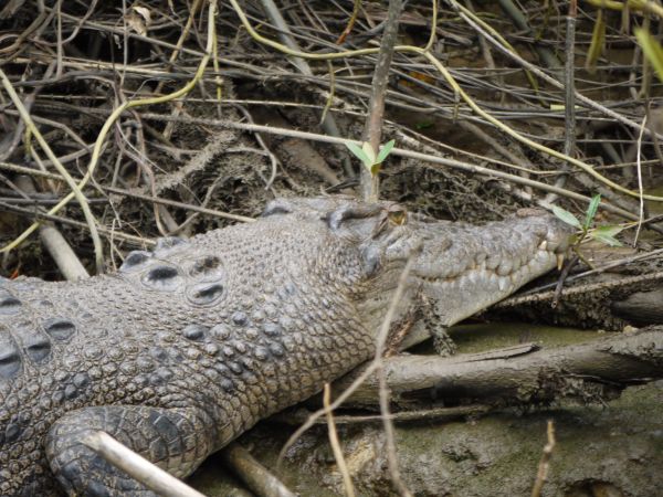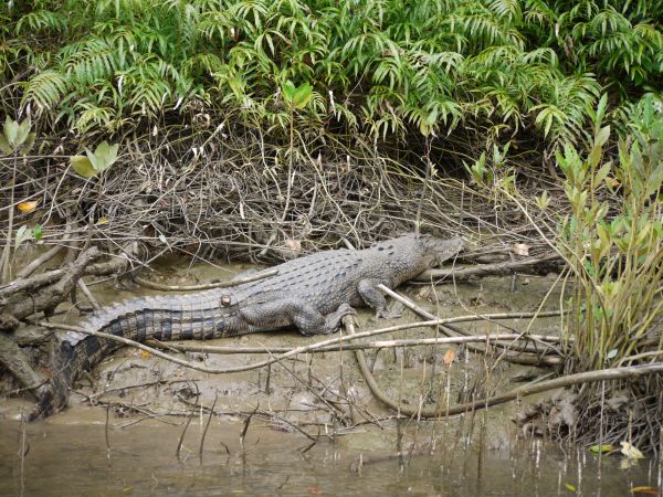 Im Urlaub braucht man kaum einen Wecker. Wir sind um 7 Uhr bereits putzmunter und genießen ein ganz exzellentes Frühstück auf der Außenterasse unseres Hotels. Ein asiatischer Koch bereitet ein exzellentes Omlett mit Zutaten ganz nach Wunsch zu. Marmelade gibt es hier in kleinen Glasdöschen. Im Hinblick auf die kommende Selbstverpflegung auf den Cook Inseln wechselt die eine oder andere Dose ihren Standort vom Ständer auf dem Tisch in Sandras Handtasche. Nicht die ganz feine und eigentlich auch nicht unsere Art, aber bei dem Hotelpreis haben wir nicht wirklich ein schlechtes Gewissen. Heute soll es mit dem Auto zum Daintree River und dann weiter in den Cape Tribulation Park gehen. An Port Douglas fahren wir vorerst vorbei. Richtung Daintree. Bevor wir in den Ort kommen, erreichen wir eine große Wiese, auf der Verschiedene Ticketverkaufsstände für die Touris aufgebaut sind. Ein kleines Zeltdorf. Bushmen Insektenspray gibt es hier auch zu überhöhten Preisen. Aber wir haben uns schon im Supermarkt in Cairns eingedeckt und sprühen uns ein. Das Auto stellen wir ab, lösen ein Ticket und gehen runter zum Fluss. Wir wollen eine Bootstour auf dem Daintree River machen. Wir werden nicht enttäuscht und sehen einige Krokodile im Fluss.