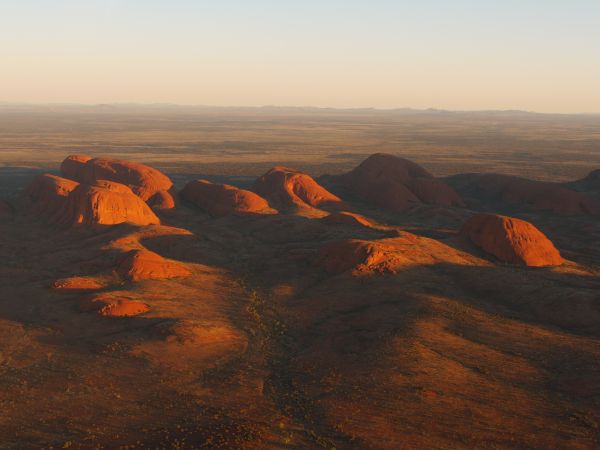 Zufrieden mit uns und der Welt fahren wir zurück ins Resort und nehmen an der Kaffeebar die Happy Hour mit und ergattern zwei Salate zum Preis von einem – das macht zusammen 10 $. So werden die Reste vom Tag ab 15 Uhr unters Volk gebracht. Am Abend gibt es dann ein weiteres Highlight. Ingmar löst sein Geburtstagsgeschenk ein. Auf dem Programm steht ein Sunset Flight über den Ayers Rock – allerdings mit einer kleinen Cesna und nicht mit einem Helikopter. Das hat den Vorteil, dass es A billiger ist und B wir beide allein mit dem Piloten im Flieger sind, weil die Nachfrage wohl sehr gering ist und (fast) alle mit dem Heli fliegen möchten. Wir genießen die Aussicht, die mindestens genauso gut ist. Nur dass die Cesna nicht in der Luft stehen bleiben kann. Das macht aber nicht wirklich etwas. Wir fliegen eine Schleife um die Katatjutas und den Ayers Rock. Wie sich die Felsen langsam rot färben ist von hier oben noch einmal spektakulärer.