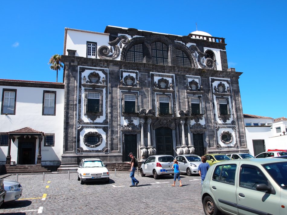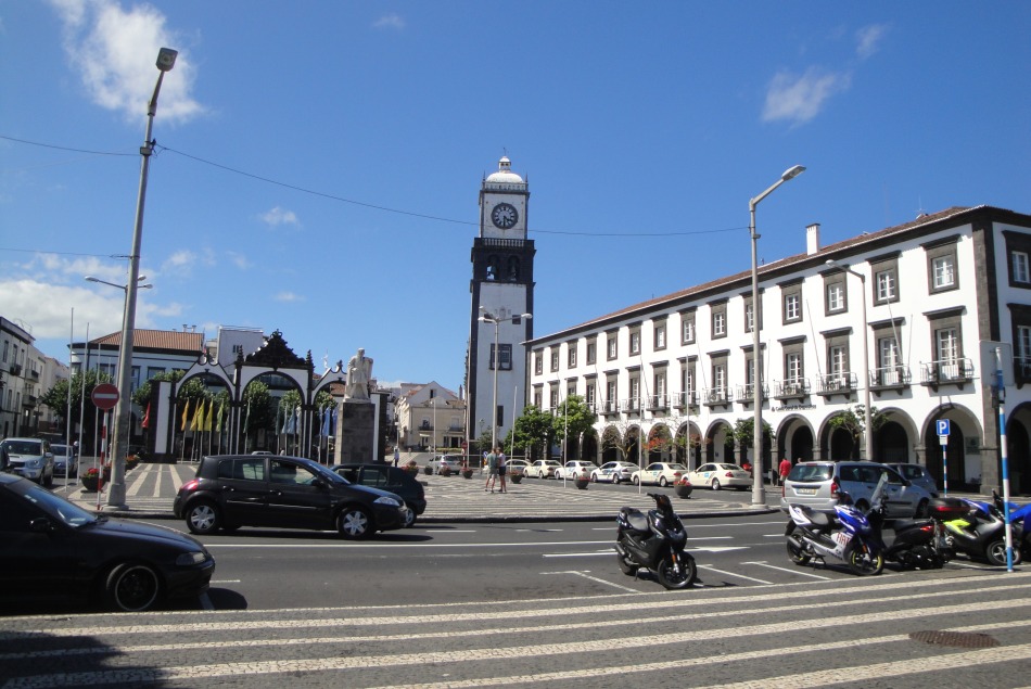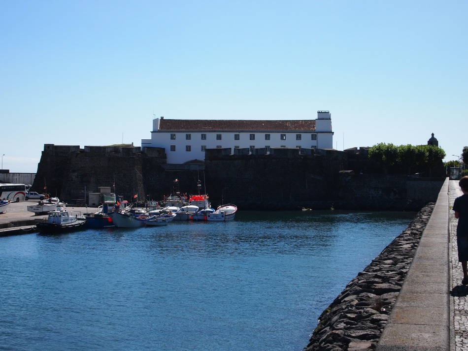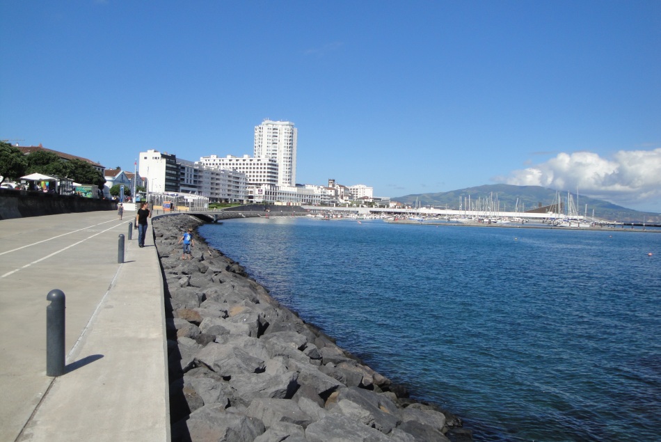 Die Koffer hatten wir als erste. Hinaus zum Taxi-Stand und schon ging es in die Stadt hinein. Der Taxifahrer zeigte uns noch das größte Einkaufszentrum der Azoren, das in der Nähe unseres Hotels, dem Sao Miguel Park Hotel, liegt. Die Zimmer waren noch nicht bereit. Wir stellten unsere Koffer in den Aufbewahrungsraum und auf gings in die Stadt, Richtung Hafen. Der Hafenbereich sah ziemlich neu errichtet aus. Generell ist zu beobachten, dass die EU-Gelder ordentlich investiert werden. Im Hintergrund der Pico da Barrosa.