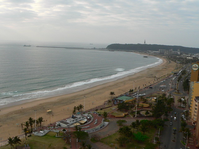 Gegen 14:30 h trauen wir uns zu Fuß auf die Straßen Durbans. Wir laufen die Golden Mile erst etwas Richtung Hafen herunter, weil auf meiner Karte dort zwei Infostellen eingezeichnet sind. Wir finden jedoch nur eine, die uns nicht so zusagt. Anschließend laufen wir in die andere Richtung bis zum Old Fort. Wir gehen durch eine Art Fußgängerzone bis zur nächsten Querstraße, wo sich das Wheel Einkausfzentrum befindet, dass früher mal eine Attraktion für Touristen gewesen ist. Wir fühlen uns nicht wohl, haben aber eine lustige Szene, als Christian Inge auf der Rolltreppe in den Haaren killert und ein Schwarzer das amüsiert beobachtet und ihm mit dem Zeigefinger „droht“. Zum Abendessen gehen wir ins zum Hotel gehörende Mustards Grill South Beach Restaurant. Die Preise sind akzeptabel.
