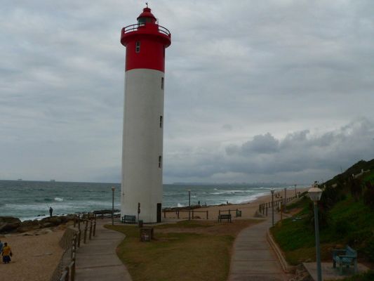 Entweder waren wir nicht am Ende des Trails oder die Luft war zu diesig. Gis und Inge sind schon früher umgekehrt, da es einerseits sehr schwül und andererseits auf und ab ging. Nach diesem Abstecher fahren wir zurück ins Hotel  Dort stärken wir uns mit Pizzabrot und als wir uns etwas ausgeruht haben, geht es gegen 12:30 h mit Inge nach Umhlanga zur Gateway Shopping Mall. Die Mall gehört zu den größten Einkaufszentren Südafrikas. Wir verbringen knapp 2,5 h dort, kaufen allerdings nur Kleinigkeiten. Zum Schluss gehen wir zu Checkers, um Getränke und eine Kleinigkeit zum Essen zu kaufen. Bei den leckeren Snacks, die hier angeboten werden, schlagen wir zu: Pommes, Chicken und Pilz Pie, und ich nehme ein Reisgericht. Das Reisgericht ist total scharf und das Fleisch ist mit Knochen durchsetzt. Der Pie hingegen ist total lecker, so dass ich zurückgehe und Nachschub hole. Danach fahren wir kurz nach Umhlanga Rocks zum Leuchtturm, möchte doch mal sehen, wie es dort aussieht, nachdem ich in vielen Romanen schon darüber gelesen habe.