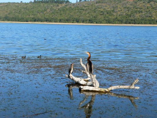 Eine Kanutour machen wir nicht mehr, denn für Inge und Gis wäre die Sitzposition im Kanu nicht vorteilhaft, und wir wollen sie an der Kanustation auch nicht auf uns warten lassen. So  fahren wir zum am Langvlei gelegenen Malachite Bird Hide. Dort können wir wunderbar einen Schlangenhalsvogel und einen Weißbrustkormoran beobachten. Auch andere kleine (Wasser-)Vögel sehen wir.