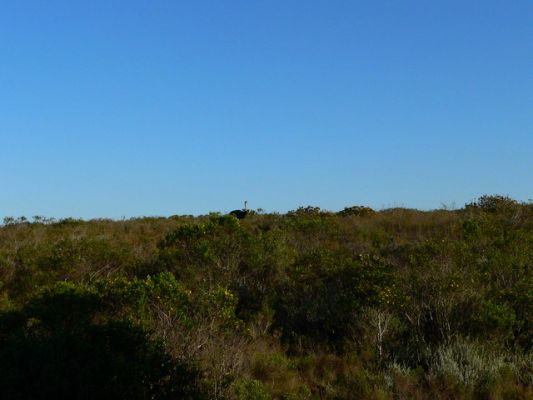 Bei der Weiterfahrt nach Rooikrans sehen wir unmittelbar an der Fahrbahn Strauße. Dieser Abzweig soll beliebt sein für das Beobachten von Walen, nur bei uns lässt sich keiner Blicken, aber eine schöne Aussicht ist uns trotzdem vergönnt.