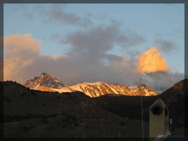 Nachdem wir gestern schon mehr oder weniger erfolgreich außerhalb von El Chalten den Sonnenaufgang angeschaut haben, schlafen wir heute ein wenig länger aus. Die Wolken, die gestern früh vor der aufgehenden Sonne hingen, haben es sich heute Morgen um den Fitz Roy herum gemütlich gemacht. Mit der Folge, dass wir nach dem Aufstehen aus dem Fenster einen in Watte gehüllten aber wunderschön rot angestrahlten Fitz Roy bewundern dürfen.