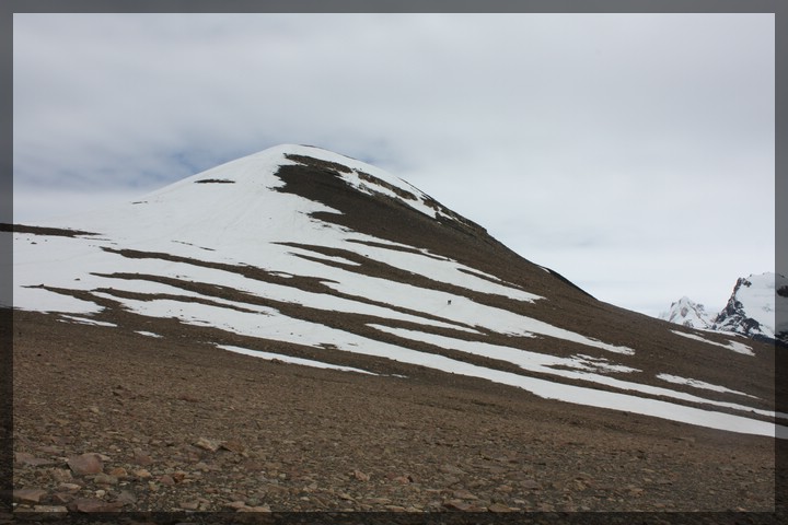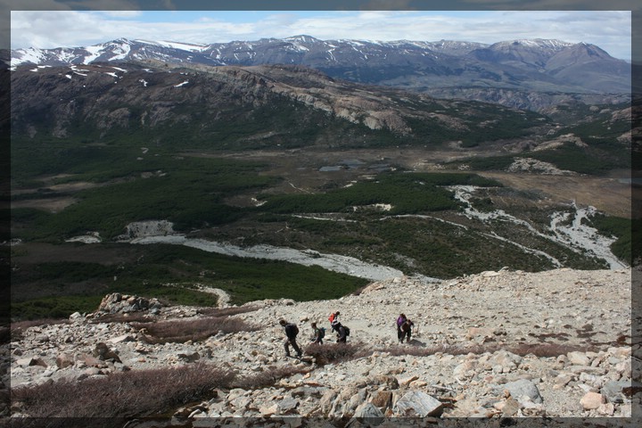 Der Blick auf das Fitz Roy-Massiv und die Laguna Torre ist von hier oben auch nicht so wirklich viel anders, als von der 100 Meter tieferen Hochebene. Allerdings haben wir vom Gipfelplateau aus einen viel schöneren Blick auf den riesigen Lago Viedma, der bis weit in die patagonische Steppe hinein reicht. Außerdem sehen wir in das Tal des Rio Tunel, in dem auch die Laguna Toro liegt. Auch das äußerste Ende des in dieses Tal fließenden Glaciar Tunel ist gerade so zu erkennen. Nach einer längeren Gipfelpause treten wir den Rückweg an. Nach Überqueren der etwas kniffeligen Stelle direkt unterhalb des Gipfels verläuft der erste Teil des Abstiegs sehr schnell und auch sehr spaßig: Im Gegensatz zum Aufstieg umgehen wir die Schneefelder am Gipfelhang nun gerade nicht mehr sondern fahren diese ab. Ab der 100 Meter unterhalb des Gipfels gelegenen Hochebene verläuft der Abstieg entlang der Anstiegsroute. Waren wir bei dem Weg nach oben noch nahezu alleine gewesen, so ist nun beeindruckend viel Gegenverkehr unterwegs, teilweise in riesigen Gruppen.