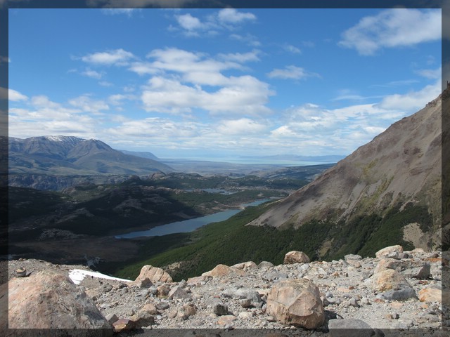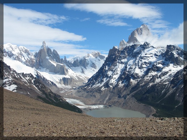 Wir gehen flott weiter und kommen bald vom karg bewachsenen Bereich auf eine nur noch aus Schotter bestehende Hochebene. Der Verlauf des Weges wird hier durch kleine Markierungen angezeigt. Wir laufen diese Hochebene ein Stück nach Nordwesten und sind sprachlos wegen des tollen Blicks, der sich uns bietet: Wir sehen tief unter uns das Ziel unserer gestrigen Wanderung, die milchiggraue Laguna Torre. Darum das geschwungene Rund der Gletschermoräne, auf der wir gestern herumgelaufen sind. Links davon sehen wir das Ende des Glaciar Grande und dahinter das Fitz Roy-Massiv mit Cerro Torre und Fitz Roy. Der Himmel ist nahezu komplett wolkenfrei, nur in der Nähe der Berggipfel hängen einige Wattebäusche. Wir pausieren erst mal ausgiebig und genießen den phantastischen Ausblick.