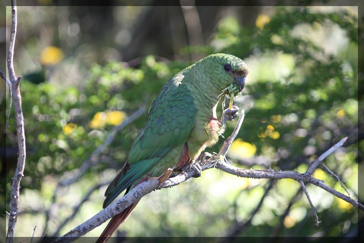 Wir fahren in die Stadt, decken uns mit Vorräten ein und löschen in einem Cafe unseren Durst. Dazu gönnen wir uns neben je einer kühlen Limonade eine für Argentinien typische Spezialität: Einen Submarino. Dabei handelt es sich um eine Trinkschokolade, deren Schokoladeanteil noch in fester Form serviert wird. Wir bekommen je eine Tasse heißer Milch und ein Stück Schokolade. Die Schokolade wird in die Milch eingetaucht und löst sich langsam darin auf. Sehr lecker. Der Name Submarino kommt daher, weil wohl das Untertauchen der Schokolade in der heißen Milch irgendjemanden an das Untertauchen eines U-Boots erinnert hat. Wir verlassen El Chalten in nordwestlicher Richtung. Hier ist die Straße wieder unasphaltiert. Unser erstes Ziel ist der Chorrillo del Salto, ein nur wenige hundert Meter Fußweg von der Straße entfernter Wasserfall. Dieser ist zwar im Prinzip sehr nett. Allerdings sind wir zur absolut falschesten Tagszeit hier, denn der Wasserfall liegt aufgrund des nachmittäglichen Sonnenstands komplett im Schatten. Wir entscheiden uns, noch mal wiederzukommen und laufen zurück zum Auto. Dabei entdecken wir in einem Busch direkt am Parkplatz zwei Papageien, die dort an Blüten knabbern. Wir beobachten die Vögel eine Zeit lang und sehen, wie einer der Papageien eine abgerissene Löwenzahlblüte in seine Klaue nimmt, hochhält und genüsslich abknabbert. Wie ein Mensch, der ein Eis an Stiel genießt.
