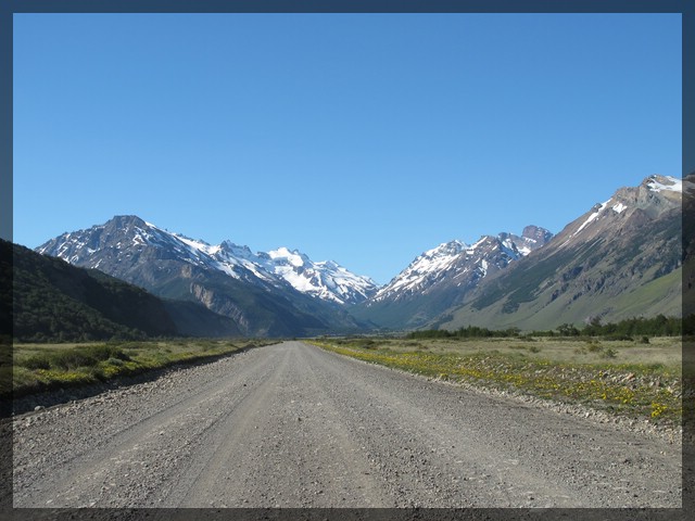 Wir fahren die Straße noch ein Stück weiter. Hier öffnet sich das zuvor sehr schmale Tal des Rio de las Vueltas. Eine wunderschöne urwüchsige Landschaft, die uns entfernt an Kanada erinnert. Im Prinzip führt die Straße von hier aus nirgendwo hin: Sie endet in einem schmalen Tal am Südufer des Lago del Desierto. Von hier aus könnte man mit einem kleinen Boot auf die andere Seite des Sees übersetzen. Dann sind es 22 Kilometer zu Fuß zum Lago O'Higgins, wobei die Grenze nach Chile überquert wird. Der Lago O'Higgins lässt sich wieder mit dem Boot überqueren - dann landet man in O'Higgins, der Stadt am allersüdlichsten Ende der Carretera Austral. Eine Traumroute für Backpacker, aber nicht für Leute, die wie wir mit dem Auto unterwegs sind.