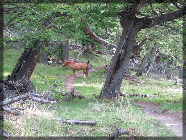Im weiteren Verlauf knickt der Weg leicht nach Süden ab und löst sich vom Fluss. Wir kommen durch einen schönen, lichten und hellen Südbuchenwald mit vielen Vögeln. Der Weg gewinnt langsam aber stetig an Höhe. Nach einiger Zeit stehen mitten auf dem Trail zwei Pferde, die zwar nicht zur Seite treten als wir uns nähern, sich aber problemlos umgehen lassen. Direkt danach kommen wir zur Nationalparkgrenze, markiert durch ein schlichtes Holztor. Das Gebiet, das sich direkt nördlich des Nationalparks anschließt und in dem sich auch unsere Hosteria befindet, ist zwar auch geschützt, befindet sich aber in Privatbesitz.