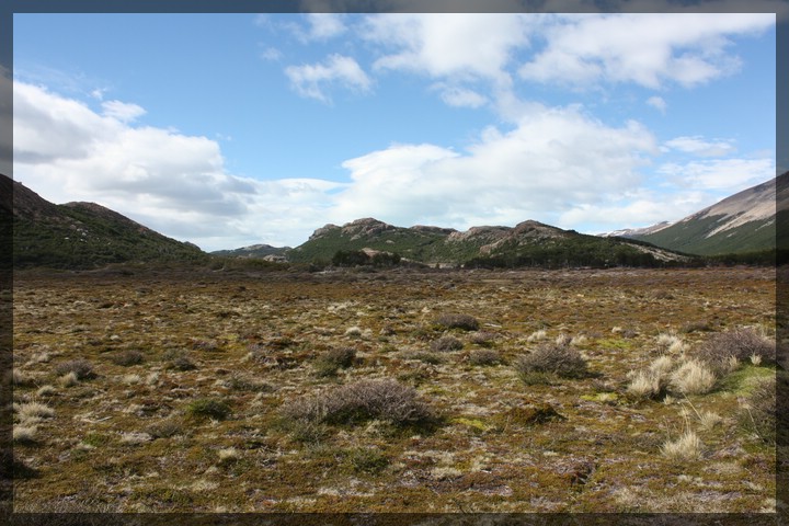Vor uns ist in einiger Entfernung schon der baumlose Gipfelhang des Loma del Pliegue Tumbado zu sehen. Dieser ist mit Schnee bedeckt, allerdings nicht komplett. Mal schauen, ob sich dort ein vernünftiger Weg finden lässt. Zunächst laufen wir aber noch ein gutes Stück durch einen wunderschönen Südbuchenwald. Hier zweigt auch der lange Trek zur Laguna Toro ab - Hin und Rückweg zu diesem Bergsee sind vernünftigerweise nur mit einer Übernachtung auf dem dortigen Campground zu schaffen. Als wir den Wald verlassen, ändert sich der Landschaftseindruck plötzlich komplett. Wir stehen vor einem karg bewachsenen Anstieg, der ebenso auch irgendwo in Schottland zu finden sein könnte. Ohne den Schutz des Bergwaldes kann nun auch der berüchtigte patagonische Wind voll zuschlagen - was zu einer deutlichen Verringerung der empfundenen Temperatur führt. Zum Glück haben wir mehrere Schichten Kleidung sowie Handschuhe und Mützen mit dabei.