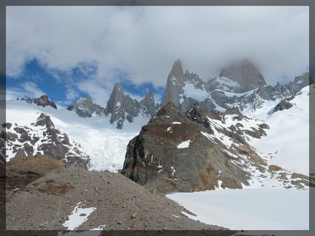 Nun liegt als letzte Schwierigkeit nur noch eine Gletschermoräne vor uns, die wieder über ein steiles Wegstück erklommen wird. Auf der Kante der Moräne bietet sich uns ein phänomenaler Blick: Vor uns liegt die Laguna de los Tres. Aber wir sehen nicht den erwarteten türkisfarbigen Gletschersee, sondern eine große flache weiße Fläche. Der See ist noch zugefroren und mit Schnee bedeckt. Einer der Wanderer, die vor uns hier sind, ist wagemutig und probiert aus, ob das Eis sein Gewicht trägt. Zum Glück hat er Erfolg damit. Direkt hinter dem See liegt der schöne Gipfelaufbau des Fitz Roy. Der Gipfel selber steckt leider in mehr oder weniger dichten Wolken und ist nur ab und an kurz zu erahnen. In der Gegenrichtung sehen wir das weite Tal des Rio Blanco, weiter im Süden die Laguna Madre und Laguna Hija sowie noch weiter südlich den großen Lago Viedma.