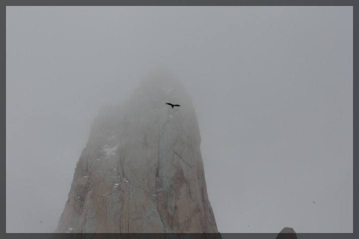 Wir machen erstmal eine Pause, während der wir zuerst zwei und dann drei Kondore sehen, die majestätisch die großen Berggipfel umkreisen. Dann wollen wir mögliche Routen für den Weiterweg auskundschaften. Von hier aus soll es einen Trail zur Laguna Suica geben, das ist der im nächsten Tal in südlicher Richtung fast dreihundert Meter unter uns gelegene Nachbarsee der Laguna de los Tres. Von dort aus könnten wir wieder zurück zum Campamento Poincenot laufen.