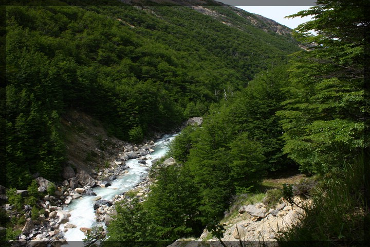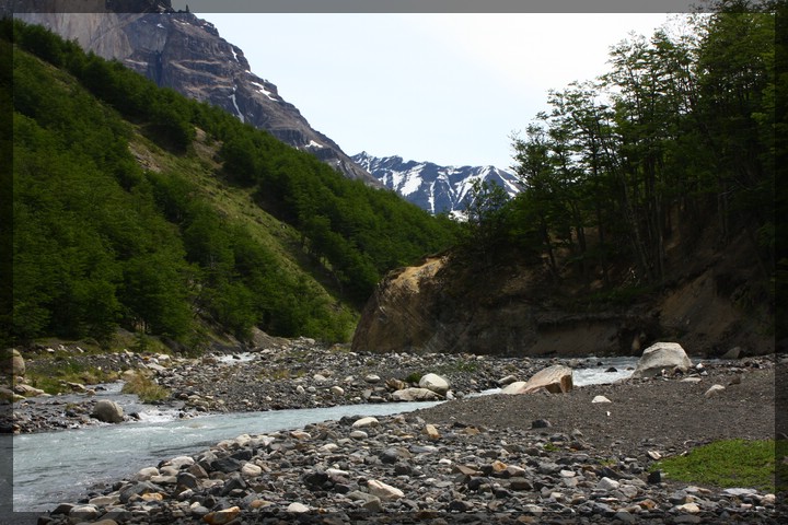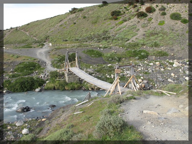 Wir erreichen eine Art Passhöhe, ab der der Weg wieder langsam bergab führt. Von hier aus ist in einiger Entfernung schon die Berghütte am Campamento Chileno zu sehen, unser erstes Etappenziel für heute. Der Weg dorthin verläuft entlang einer recht steil abfallenden Bergflanke und teilweise recht schmal über frische Lawinenrisse. An und für sich kein Problem, aber extrem höhenempfindliche oder nicht schwindelfreie Wanderer könnten hier leichte Probleme bekommen. Die Hütte hat noch geschlossen und wir trinken nur kurz etwas von unseren mitgebrachten Getränken. Weiter geht es ein kurzes Stück direkt entlang des Rio Ascencio, dann entfernt sich der Weg ein wenig vom Fluss und verläuft in einem lichten Südbuchenwald. Der Rio Ascencio und einige seiner Nebenarme werden über mehr oder weniger wackelige Holzkonstruktionen überquert.