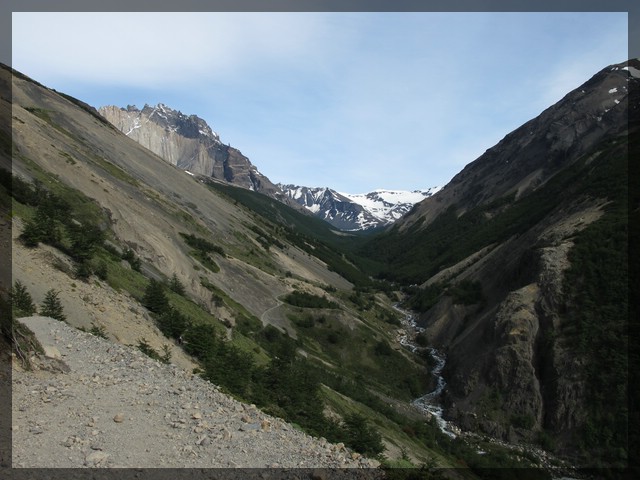 Direkt hinter der zweiten Brücke knickt der Weg nach Norden ab und verläuft ab hier mehr oder weniger entlang des Rio Ascencio in das Valle Ascencio. Mehr oder weniger deswegen, weil der Trail - hier durch baumloses Grasland verlaufend - ziemlich schnell an Höhe gewinnt, während sich der Fluss in eine sehr tiefe Schlucht mit dunkelgrauen Gesteinswänden eingegraben hat. Hier erinnert uns diese Wanderung ein wenig an eine Almwanderung irgendwo in den Alpen. Wir laufen durch ein v-förmig geschnittenes Tal, links von uns die steilen Hänge des 2668 Meter hohen Monte Almirante Nieto. Die Bergkette rechts von uns bildet den Abschluss des Torres del Paine-Massivs und ist mit knapp 1500 Metern deutlich niedriger.
