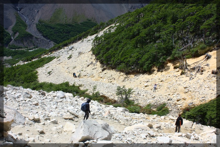 Unser Trail dagegen knickt am Campamento Torres nach links ab und führt von nun an relativ heftig bergauf. Zunächst noch durch Wald, dann über Schotter auf die riesige Wand einer Gletschermoräne zu. Auf den ersten Blick lässt sich nicht erkennen, wo entlang über diese Schotterhalde ein Weg führen soll. Die nun folgende Mischung aus zwischen grobem Blockwerk gerade so vorhandenem Weg und leichter Blockkletterei erinnert an den Gipfelaufbau so mancher Berge in den europäischen Zentralalpen.
