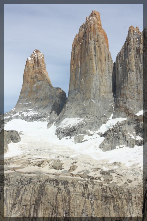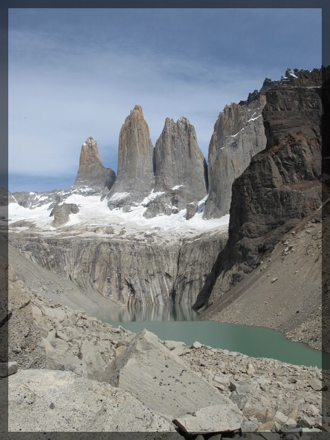 Was aber nach dem letzten Aufschwung des Weges direkt vor uns liegt, sucht in den Alpen seinesgleichen: Direkt vor uns liegt ein langgezogener türkisgrüner Gletschersee, direkt dahinter ein vom Gletscher glattgeschliffener Felshang, ein teilweise vom Schnee bedecktes Schuttkar und direkt darüber die drei senkrechten Türme der Torres del Paine: Torre Sur, Torre Central und Torre Norte. Der höchste dieser Gipfel ist der 2600 Meter hohe Torre Norte, das ist schon mächtig im Vergleich zu unserem auf 850 Höhenmetern gelegenen Gletschersee. Die senkrechte Steilwand des Torre Central ist 1200 Meter hoch - eine gewaltige und sehr viele Seillängen lange Aufgabe für Kletterer. Die Schönheit dieses Aussichtspunks ist beeindruckend.