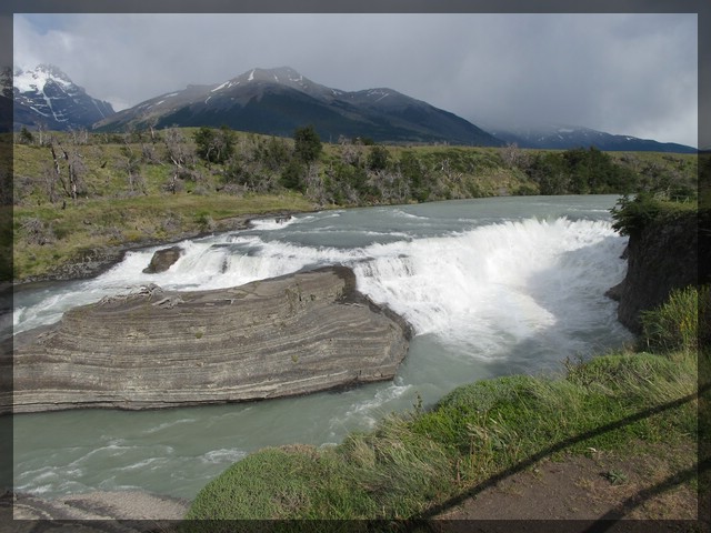 Das Wetter ist heute um einiges schlechter als in den vergangenen Tagen - der Himmel ist komplett zugezogen. Von der Straße aus auf der wir unterwegs sind müssten wir eigentlich die drei Türme der Torres del Paine klar erkennen können, in der Realität sehen wir nur Schemen durch eine dichte Schicht Wolken bzw. Hochnebel. Die Cascada Paine entpuppt sich als nicht gerade hoher aber dennoch ziemlich beeindruckender Wasserfall. Beeindruckend deswegen, weil die Abbruchkante des Wasserfalls nicht senkrecht zur Fließrichtung des Flusses steht, sondern schräg dazu. Als Folge ist der Wasserfall um einiges größer als er an dieser Stelle des Flusses eigentlich sein müsste. Nach einigen Minuten reißen wir uns los und brechen auf. Kurz bevor wir wieder losfahren trifft ein sehr interessantes Gefährt ein und zwar ein expeditionstauglicher Reisebus mit dem laut Beschriftung Touren in ganz Südamerika durchgeführt werden. Und das ganze mit einem Kennzeichen aus Holland. Auch wenn wir das im Rahmen einer kurzen Begrüßung schlecht definitiv beurteilen können, sind die Fahrgäste wohl auch Holländer.