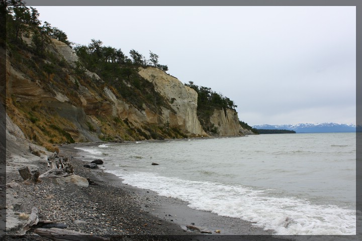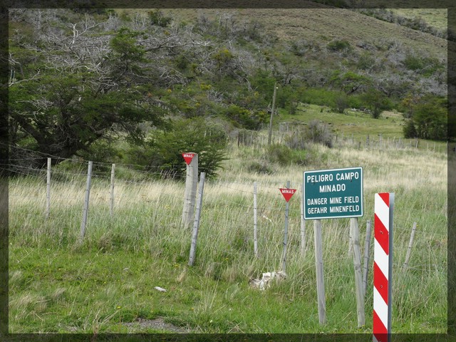 Hinter Cerro Castillo führt die Straße durch eine viel grüner und mitteleuropäischer aussehende Hügellandschaft als wir das erwartet hätten. Was allerdings nicht so ganz nach Mitteleuropa passen würde, sind die an einigen Stellen am Straßenrand stehenden Schilder, die vor Minenfeldern warnen. Diese Minenfelder sind ein Überbleibsel des schon erwähnten Grenzkonflikts zwischen Argentinien und Chile. Als 1881 die Grenze zwischen diesen beiden Ländern vertraglich geregelt wurde, war man bei der Definition des Grenzverlaufs nicht an allen Stellen ausreichend exakt. Das war zum Beispiel in Patagonien auch nicht wirklich nötig, da dieses nahezu unbewohnte Land niemanden so recht interessierte. Viel später dann kamen Diskussionen und Streit um die Grenze auf, ein Zankapfel waren die Inseln südlich des Beaglekanal, einer wichtige Wasserstraße im Süden von Feuerland. Ein internationales Schiedsgericht entschied 1977, dass diese Inseln weiterhin zu Chile gehören sollen. Logischerweise war die argentinische Militärjunta mit dieser Entscheidung nicht glücklich und begann mit Kriegsvorbereitungen. Die militärisch deutlich schwächeren Chilenen bereiteten sich auf die Verteidigung ihres Landes vor, unter anderem durch das Anlegen der Minenfelder an denen wir vorbei fahren. Letztendlich konnte der drohende Krieg durch Intervention von Johannes Paul II abgewendet werden. Die argentinische Junta suchte sich ein paar Jahre später mit den Falklandinseln ein neues Ziel um ihren Herrschaftsbereich auszudehnen, mit bekanntem Ausgang.