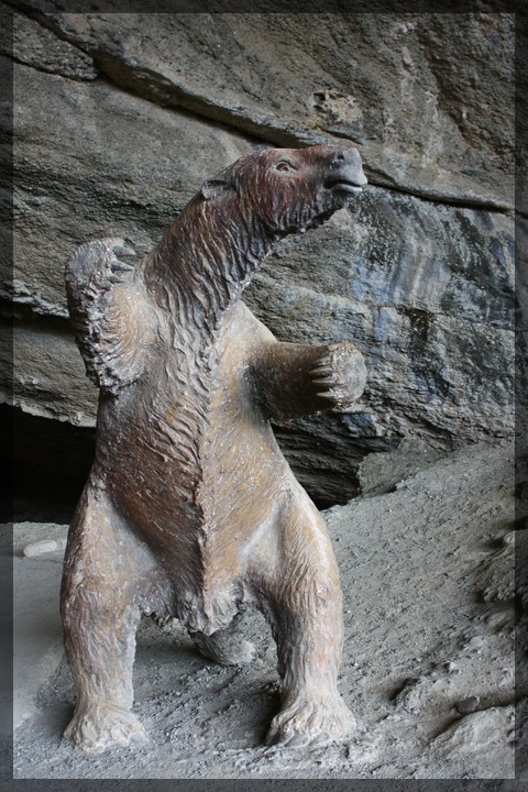 Wir kommen an einen Berg vorbei, über dem zwei Kondore majestätisch ihre Kreise ziehen. Einige Kilometer vor Puerto Natales erreichen wir die Abzweigung zur Cueva del Milodon, einer Höhle in der unter anderem die Überreste eines prähistorischen südamerikanischen Riesenfaultieres, auch bekannt als Mylodon, gefunden wurden. Diese Höhle zählt zwar nicht unbedingt zum Pflichtprogramm eines Patagonien-Reisenden. Aber nachdem wir zur Vorbereitung unserer Reise unter anderem den Reisebericht "In Patagonien" von Bruce Chatwin gelesen haben, müssen wir sie uns trotzdem anschauen. Die folgende rund acht Kilometer lange rumpelige Schotterstraße besteht aus einer einzigen großen Baustelle. Wird hier nur hergerichtet und gegradet oder zum asphaltieren vorbereitet? Wir kommen zu einer kleinen Ansammlung von Gebäuden, stellen unser Auto ab und bezahlen den Eintritt für das Monumento Natural Cueva del Milodon. Es gibt eine kleine Ausstellung zur Geschichte der Tierwelt hier in der Gegend und zur Entstehungsgeschichte der Höhle. Zur Höhle selber führt ein 350 Meter langer Trail und vor der Höhle steht ein lebensgroß nachgebautes Mylodon.