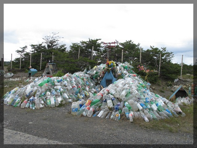 Wir fahren weiter nach Puerto Natales. Hier endet die berühmte von Puerto Montt ausgehende Navimag-Fährverbindung. Irgendwie schließt sich hier auch für uns ein Kreis, denn diese Fährfahrt war in der frühen Planungsphase auch für unsere Reise vorgesehen. Den Ausschlag, darauf zu verzichten gaben dann ein unschlagbares Angebot für eine Einwegmiete von Puerto Montt nach Punta Arenas und die deutlich interessantere Streckenführung im Landesinneren. Puerto Natales sieht nach einem sehr netten kleinen Hafenstädtchen aus. Wir legen dennoch nur einen kurzen Tankstop ein und fahren dann auf der Ruta 9 weiter in Richtung Punta Arenas. Ein paar Kilometer außerhalb der Stadt kommen wir an einem kleinen Schrein am Straßenrand vorbei. Neben dem Schrein befindet sich etwas, das auf den ersten Blick nach einem riesigen Haufen nicht fachgerecht entsorgter PET-Flaschen aussieht. Es handelt sich aber keineswegs um illegale Müllentsorgung, sondern der Schrein ist ein der Difunta Correa gewidmetes Heiligtum. Difunta Correa hieß eigentlich María Antonia Deolinda y Correa und war eine argentinische Mutter. 1841 wurde ihr Mann von Soldaten zum Militärdienst gezwungen und verschleppt. In ihrer Verzweiflung folgte sie mitsamt dem Säugling ihrem verschleppten Mann durch die Wüste - ohne ausreichende Wasservorräte. Ein paar Tage später wurde sie tot in der Wüste aufgefunden. Das Kind hatte von der Muttermilch getrunken und wie durch ein Wunder überlebt. Die Difunta Correa ist in Argentinien und Chile eine inoffizielle Heilige und gilt als Schutzpatronin der Reisenden. Zu ihrem Grab bei Vallecito in Argentinien werden ausgedehnte Wallfahren veranstaltet. Und überall entlang der Straßen gibt es Schreine, an denen vor allem Fernfahrer volle Wasserflaschen für die Difunta Correa ablegen.