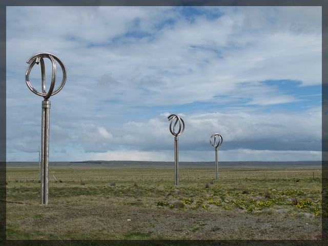 Ab hier wird die Landschaft richtig eintönig aber dadurch auch wieder richtig interessant. Die Gegend ist zunächst relativ hügelig und von erstaunlich vielen Bäumen bestanden. Hier sehen wir zweimal Gauchos, südamerikanische Viehhirten, die ihre Herden vom Pferd aus direkt an der Straße entlang treiben. Später nimmt die Anzahl der Bäume entlang der Straße ab und die Landschaft wird flacher und steppenartiger. Links und rechts der Straße befindet sich ein dichter Teppich von gelben Frühlingsblumen. Die einzige nennenswerte Ortschaft auf diesem Abschnitt ist Villa Tehuelches - mit 151 Einwohnern die wichtigste Metropole und Hauptstadt im Verwaltungsbezirk Laguna Blanca. Ein paar Kilometer südlich von Villa Tehuelches steht direkt an der Straße eine sehr interessante Installation, bei der auf vier Stahlpfosten Windschaufeln geschraubt wurden. Das Ganze soll ein Denkmal für den Wind sein. So etwas passt auf jeden Fall hier in die Gegend. Gerade jetzt ist die Stärke des über die Steppe tobenden Winds nicht gerade gering, was Dirk am Steuer unseres Pick Ups zu stetiger Konzentration und zum andauernden Gegenlenken zwingt. Wir kommen auch an einigen Lagunen vorbei, kleineren Seen, beeindruckend tief blau in der Farbe. Hier sehen wir viele Wasservögel, darunter auch Flamingos. Dann ist endlich die Kreuzung der Ruta 9 mit der nach Osten führenden Ruta 255 erreicht und damit der weitere Einzugsbereich von Punta Arenas, der mit 120000 Einwohnern bei weitem größten Stadt im Süden Patagoniens. Zu unserer linken Seite sehen wir zunächst das Wasser der großen Laguna Cabeza del Mar und etwa später tatsächlich das Meer, die legendäre Magellanstraße.