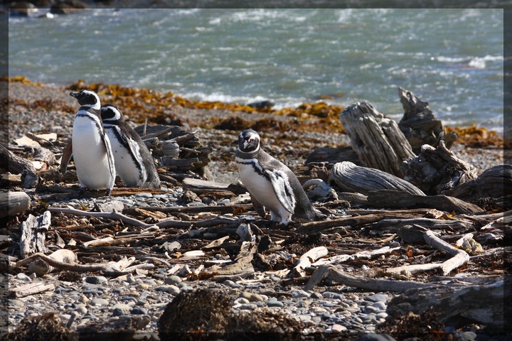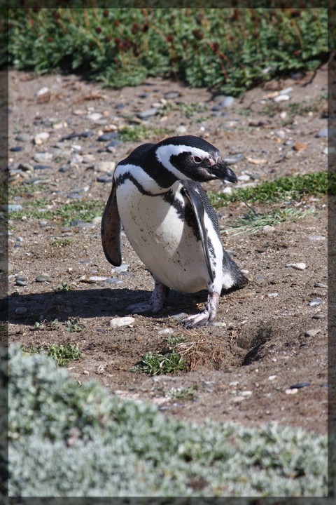 Eintritt müssen wir zweimal bezahlen: Für das letzte Stück der Straße zur Pinguinkolonie und dann für die Kolonie selber. Der Wind hat inzwischen eine Stärke erreicht, die sich als brutal bezeichnen lässt - das kann durchaus ein begrenzender Faktor für die Besuchszeit bei den Pinguinen sein - viele andere Besucher hetzen auffällig schnell durch. Bei den Pinguinen handelt es sich um Magellanpinguine. Diese lassen sich von ihren weiter nördlich lebenden Verwandten, den Humboldtpinguinen, leicht dadurch unterscheiden, dass die Zeichnung des Gefieders ein zusätzliches schwarzes Band quer über den Hals aufweist. Durch die Pinguinkolonie führt ein Rundweg, entlang dem es eine Aussichtsplattform auf einen von Pinguinen belagerten Strand sowie zwei Aussichtstürme gibt. Der absolute Höhepunkt ist der sich gleich zu Beginn des Rundwegs befindende Strand. Denn gerade im Moment kehren die Tiere zurück, die den Tag auf dem Meer verbracht und dort nach Nahrung gesucht haben. Hier ist richtig was los - wir sehen jede Menge unherwatschelnde oder auch faul herumliegende Pinguine. Ein tolles Schauspiel. Viele der Tiere sind auch auf dem Weg zu ihren im Landesinneren gelegenen Höhlen. Einer der Pinguine muss dazu sogar den für die menschlichen Besucher angelegten Weg überqueren. Sehr zur Freude der anwesenden Touristen. Ein Teil der Strecke zu den Pinguinhöhlen verläuft auf etwas vertieften Wegen, was zur Folge hat, dass wir von den watschelnden Pinguinen oft nur den Kopf sehen können. Aufgrund der Tageszeit sind an den anderen Aussichtspunkten deutlich weniger Pinguine zu sehen. Wir schließen den Rundweg ab, schauen noch kurz in den winzigen Andenkenladen und brechen dann wieder auf.