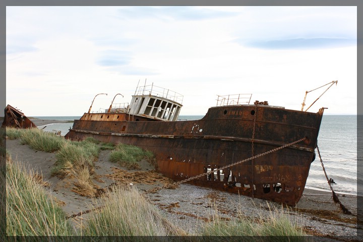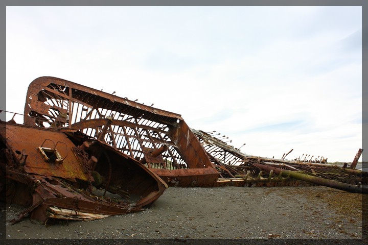 Am Strand direkt neben der Estancia liegen zwei Schiffswracks: Der Clipper Ambassador und das Dampfschiff Amadeo. Beide Schiffe gehörten einstmals zur Flotte der Familie Menendez und wurden vor etwa 70 Jahren hier absichtlich auf Grund gesetzt. Die Ambassador ist einer der wenigen weltweit noch erhaltenen echten Clipper in Kompositbauweise: Ein Stahlskelett wurde mit einer Holzhülle beplankt - ein weiteres Exemplar eines solchen Schiffes ist die berühmte Cutty Sark. Natürlich kann man darüber diskutieren, ob man dieses Wrack an der Estancia San Gregorio als erhaltenes Schiff bezeichnen kann: Wir laufen zum Stand hinunter, immer gefolgt von einem kleinen frechen Hund, der auf der Estancia lebt. Am Strand angekommen finden wir von dem Segelschiff nur noch das arg ramponierte Stahlgerippe. Die Amadeo sieht noch ein klein wenig kompletter aus. Besonders interessant finden wir hier den Blick durch die aufgerissene Außenhaut des Schiffes auf die riesigen Heizkessel.