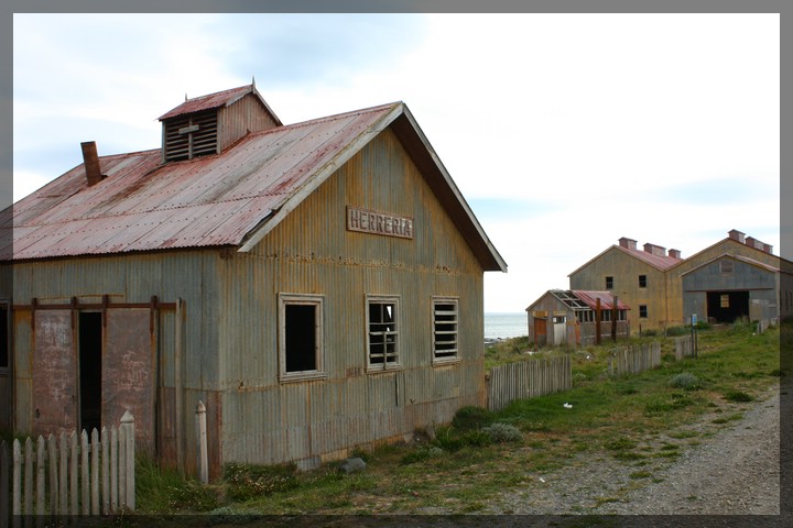 Gut 70 Kilometer hinter der Abzweigung von der Ruta 9 erreichen wir die direkt an der Magellanstraße gelegene Estancia San Gregorio. Dieser gigantische Schafzuchtbetrieb wurde 1890 vom Schafbaron Jose Menendez aus Punta Arenas errichtet. Bei der Estancia handelte es sich fast um eine kleine Ortschaft, komplett mit Eisenbahnanschluss und Hafen zum Transport der Wolle. Ihren Höhepunkt erreichte die Ansiedlung im ersten Drittel des 20. Jahrhunderts. Auf einer Fläche von 13500 Quadratkilometern lebten hier über zwei Millionen Schafe. Heute ist die Enstancia nahezu komplett verlassen, nur am östlichen Rand gibt es ein paar neuere Gebäude, in denen heute noch Menschen leben. Die Straße führt direkt an den alten Gebäuden vorbei. Wir halten an und schauen uns die noch recht gut erhaltenen Ruinen an. Die Gebäude strahlen auch im ziemlich verfallenen Zustand noch eine gewisse Pracht aus. Es gibt Verwaltungsgebäude, eine Schmiede, ein Materiallager, nicht zu vergessen die riesige Halle, in der die Schafe geschoren wurden, und noch vieles mehr.