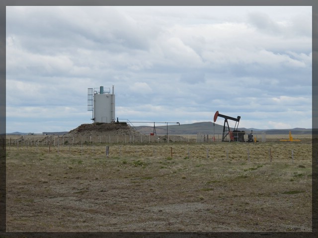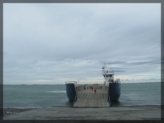 Hinter der Estancia San Gregorio sieht die Gegend im Prinzip genauso aus wie vorher, mit der Ausnahme dass sich hier ab und zu neben der Straße Förderanlagen für Erdöl und/oder Erdgas befinden. Nach kurzer Fahrt kommen wir zur Abzweigung der Ruta 257, die von hier aus in südliche Richtung zum Fährhafen Punta Delgada führt. Dieser Hafen besteht aus wenig mehr als zwei, drei Gebäuden der Schifffahrtgesellschaft und der chilenischen Polizei und liegt an der im weiteren Umkreis schmalsten Stelle der Magellanstraße. Hier trennen nur knapp viereinhalb Kilometer das Festland und Feuerland. Neben uns sind nur zwei argentinische LKW da - somit kommen wir problemlos mit der nächsten Fähre mit. Diese legt nur wenige Minuten nachdem wir angekommen sind an der Anlegerampe an - das war perfektes Timing.
