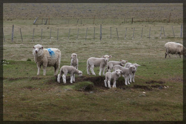 Wir nehmen unser letztes Frühstück im Parque Nacional Torres del Paine zu uns, packen zusammen, checken aus dem Hotel aus und fahren los. Zunächst geht es über die 7.5 Kilometer lange Hotelzufahrt zurück in Richtung des Parkeingangs an der Laguna Amarga. Dieses Mal bekommen wir unser Auto über die schmale Brücke am Rio Paine, ohne dass einer der Außenspiegel Bekanntschaft mit der Stahlkonstruktion der Brücke macht. Wir verlassen den Park und biegen nach nur sehr kurzer Strecke am Refugio Laguna Amarga wieder von der Hauptstraße ab. Wir wollen zum Abschluss unseres Besuchs in diesem Nationalpark noch die Cascada Paine anschauen - wofür vor fünf Tagen ja keine Zeit geblieben war. Die Straße zu diesem Wasserfall überquert nach ein paar hundert Metern wieder die Nationalparkgrenze. Direkt am Zaun, der Privatbesitz vom Nationalpark trennt steht eine größere Schafherde mit sehr vielen kleinen Lämmern. Zur Hälfte auf der einen Seite des Zauns und zur anderen Hälfte auf der anderen Seite. Dadurch, dass wir mit unserem Auto vorsichtig durch das Tor fahren, treiben wir noch einige Schafe mehr auf das Gelände des Nationalparks. Hoffentlich ist das in Ordnung so.