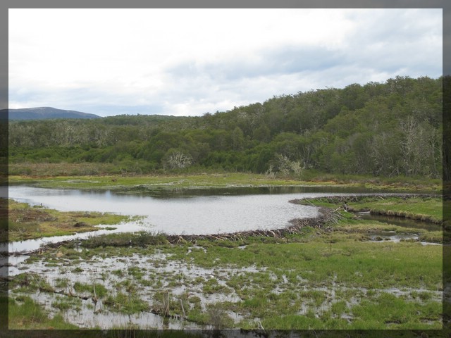Der Hunger und die darauffolgende Suche nach einem Supermarkt treibt uns nach Rio Grande. Diese Stadt wurde als Handelszentrum und Hafen für die umgebenden Estancias gegründet und erlebte einen Boom als von der argentinischen Regierung auf Feuerland eine Sonderhandelszone eingerichtet wurde und als zudem Öl entdeckt wurde. Die Stadt hat heute 66000 Einwohner und den stressigsten Stadtverkehr, den wir im Verlauf unserer Reise erlebt haben. Der Supermarkt, in dem wir landen hat dann auch gigantische Ausmaße und entspricht damit so gar nicht dem, was wir uns an Geschäften in Feuerland vorgestellt hätten. Frisch mit Sandwiches versehen verlassen wir die Stadt wieder und kommen etwas im Süden von Rio Grande endlich zu dem schon viel früher erwarteten Wechsel der Vegetation. Zuerst stehen ein paar vereinzelte Büsche neben der Straße, dann einzelne Bäume und schließlich ein ganzer Wald. Gleichzeitig ändert sich der Ausblick auf den Horizont schlagartig: Statt ewiger Weite sehen wir nun in der Ferne eine hohe Bergkette, die südlichsten Ausläufer der Anden. Hier hat übrigens jedes zweite einheimische Auto welches wir sehen einen Anhänger oder eine Ladefläche, auf der ein Quad festgezurrt ist. Wir wissen nicht, ob das daran liegt, dass Wochenende ist oder an der Uhrzeit oder möglicherweise daran, dass man auf Feuerland keine anderen spannenden Dinge außer Quadfahren untenehmen kann.