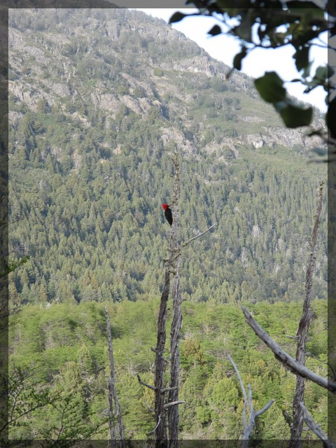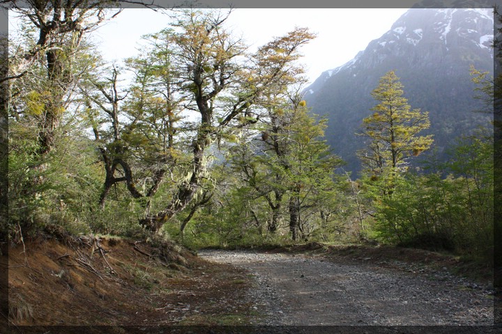 Unterwegs auf der Ruta 71 kurz vor dem Parque Nacional Los Alerces.Hinter Cholila wird die Straße ein wenig rumpeliger und führt interessant bergauf und bergab. Von einer dieser Anhebungen aus, kurz hinter der Ortschaft Villa Lago Rivadavia, sehen wir im grünen Tal eine Ansammlung rosafarbener Punkte stehen und umherlaufen. Zu unserer großen Überraschung sind das unsere ersten Flamingos im Verlauf dieser Reise. Wir hätten diese Vögel eigentlich noch ein wenig südlicher erwartet. Einige Kilometer südlicher, insgesamt 26 Kilometer hinter Cholila, können wir kurz einen Blick auf den rechts von uns gelegenen langgezogenen Lago Rivadavia werfen, dann verläuft die Straße durch dichten Wald. Hier erreichen wir den nördlichen Eingang des Parque Nacional Los Alerces. Wir werden freundlich begrüßt, tragen uns in die Besucherliste ein und bekommen etwas Informationsmaterial in die Hand gedrückt. Der Parque Nacional Los Alerces ist bekannt für seine wunderschöne Gebirgslandschaft, die Seen, Tierwelt und die seltenen Alercen. Alercen, auch als patagonische Zypressen bekannt, sind eindrucksvolle Bäume: Sie können bis über 3000 Jahre alt werden und 50 Meter hoch bei einem Durchmesser des Stamms von bis zu fünf Metern. Alercen leben nur in einem kleinen Bereich, beiderseits der Anden in Argentinien und Chile. Da sie sehr langsam wachsen, wurden sie durch Abholzen fast komplett ausgerottet und sind heute streng geschützt.